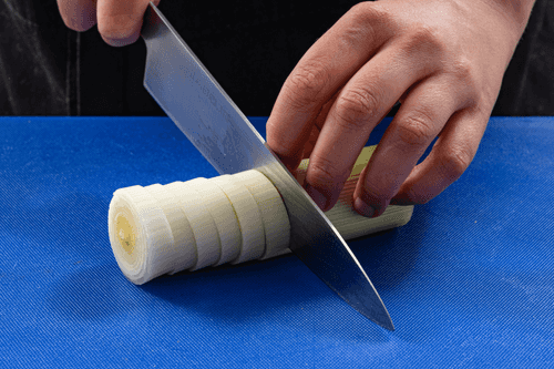 Отрезать от лука-порея зеленую часть (ее можно использовать, например, в бульоне) и кончик луковицы. Хорошо промыть белую часть, чтобы избавить от песка. Нарезать ее кольцами шириной около 1 см.