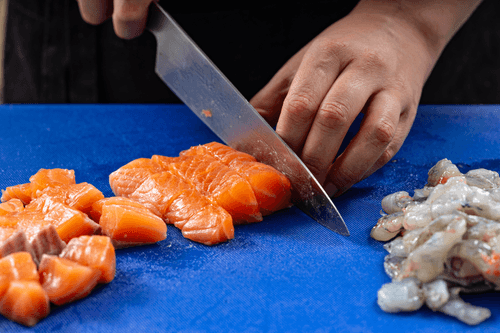 Лосось нарезать крупными кубиками. Креветки нарезать вдоль пополам, очистив от пищевода.