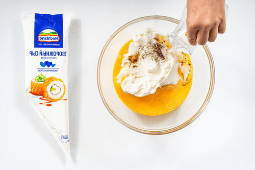 В миске взбить 3 яйца. Добавить творожный сыр Hochland для кулинарии и смешать до однородности. Благодаря высокой термостойкости творожный сыр Hochland поможет начинке сохранить форму. Следом добавить молоко, соль, перец и щепотку мускатного ореха.