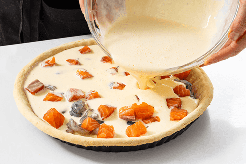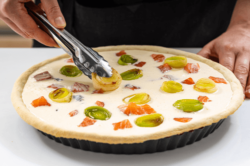 Киш с красной рыбой, креветками и луком-пореем — изысканное блюдо французской кухни, покоряющее своей нежностью и богатством вкусов. Этот открытый пирог с хрустящим тестом и воздушной сливочной начинкой был придуман в Лотарингии и стал гастрономическим символом Франции. Сочетание жирного лосося и деликатных креветок придает блюду утонченность, а карамелизированный лук-порей — мягкую сладковатую нотку. Сливочный творожный сыр делает текстуру бархатистой, а мускатный орех добавляет пикантности. Киш идеально подходит для праздничного ужина или неспешного воскресного завтрака. Его можно подавать как теплым, так и холодным, дополняя свежими салатами и белым вином. Это блюдо воплощает французское искусство наслаждения жизнью и вкусом.