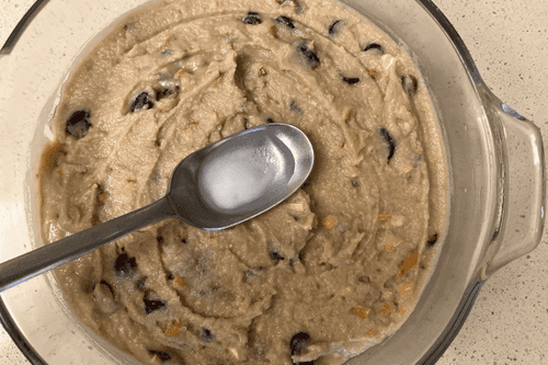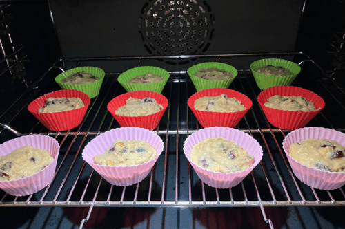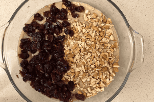 Слить клюкву и добавить ее и резанные орехи к тесту.