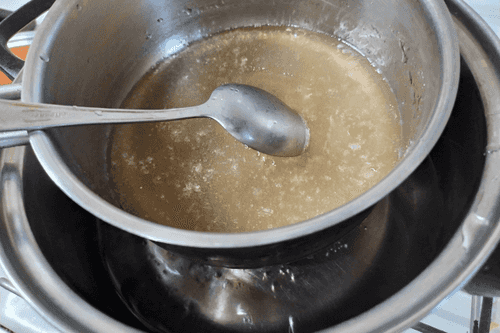 Желатин залить холодной водой и дать постоять 15 минут для разбухания. Затем прогреть его на водяной бане 10–12 минут.