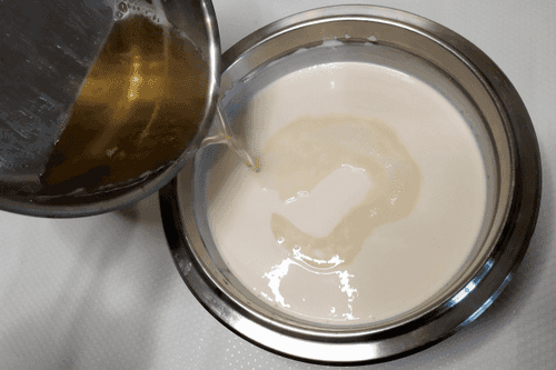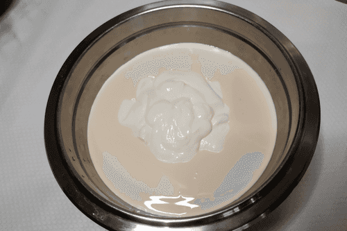 Вылить горячий желатин в молочную массу, хорошо перемешать.