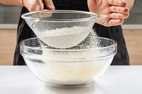 Просеять муку вместе с разрыхлителем.