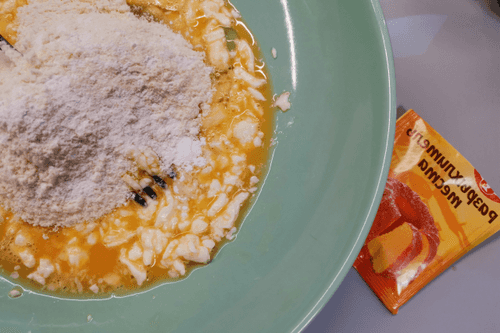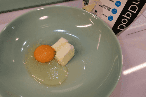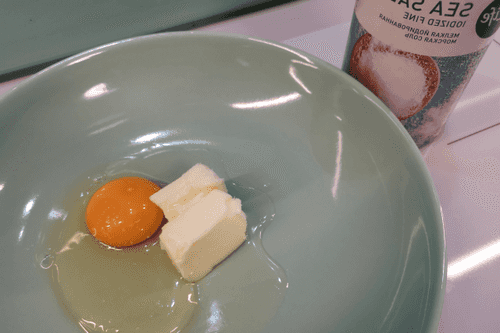 В глубокую миску вбить яйцо, добавить масло и посолить.