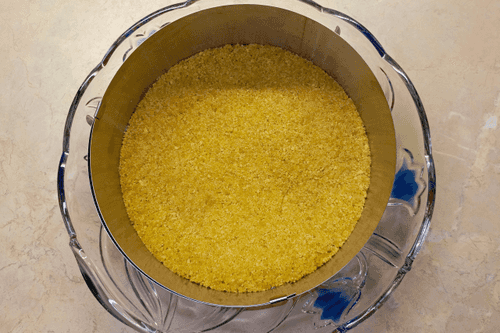 Поставить в блюдо для чизкейка кольцо, выложить в него тесто, распределить по дну, уплотнить дном стакана.