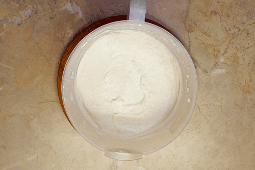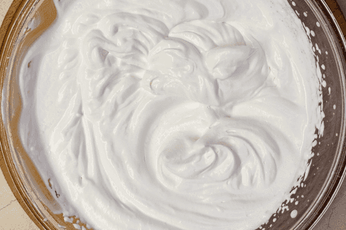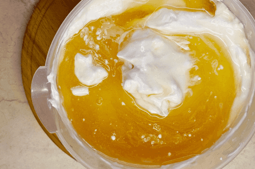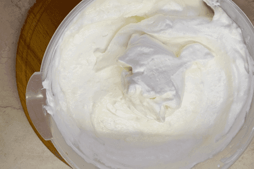 Смешать творог со взбитыми сливками, добавляя сливки порциями и перемешивая смесь лопаткой снизу вверх.