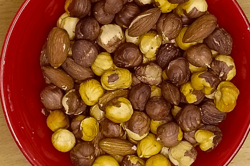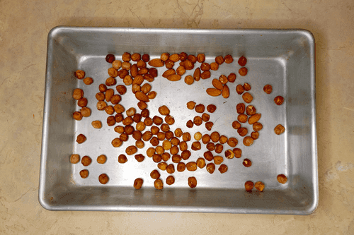 Орехи (фундук, миндаль) подсушить в духовке в течение 10 минут при 160 градусах.