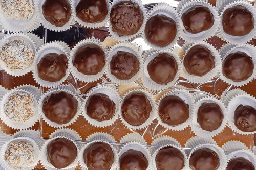 Достать из холодильника конфеты, искупать каждую в шоколаде (на холодных конфетах шоколад застывает очень быстро), разложить по капсулам, убрать в контейнер.