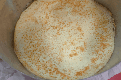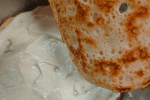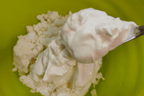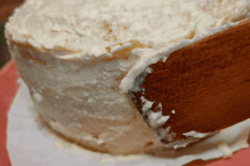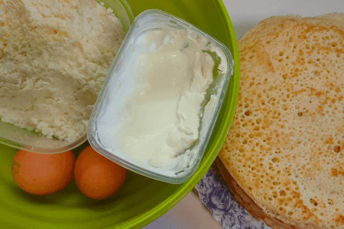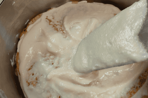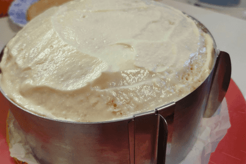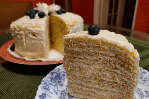 Затем следующий блин и снова крем. Необходимо оставить немного крема для того, чтобы промазать края готового торта, примерно 5 столовых ложек.