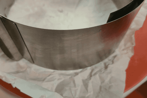 Взять кондитерское кольцо и поставить на тарелку на пергамент.