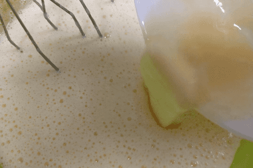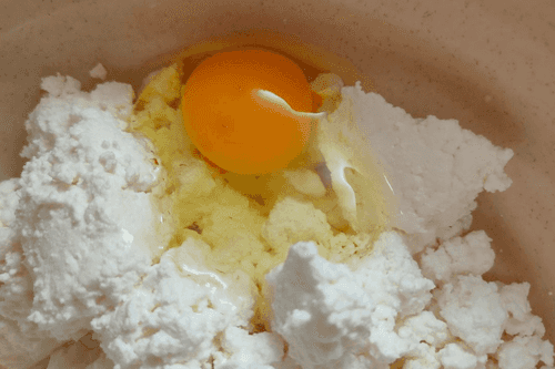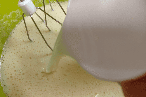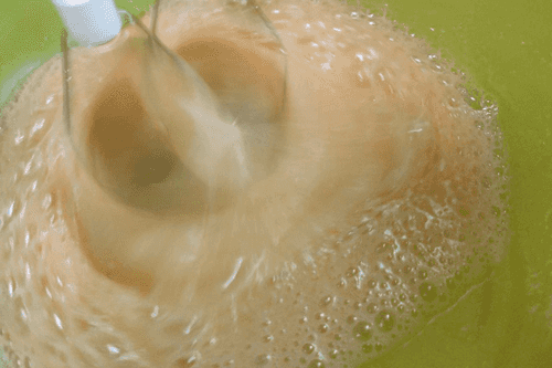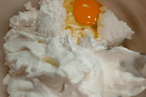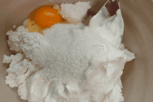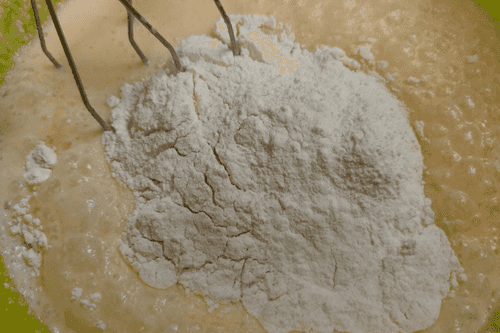 Добавить муку и перемешивать миксером до однородности. Тесто получится тягучее и плотное, но не густое.