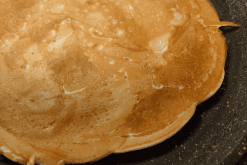 Когда блин зарумянится с нижней стороны и будет сухим сверху, перевернуть его и дожарить.