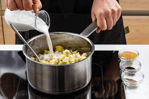 К каше добавить кокосовое молоко, грушу, кардамон, ваниль, соль и ⅔ сахара.