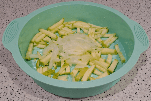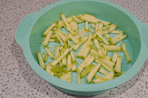 Кабачок хорошо вымыть, нарезать соломкой, выложить в форму для запекания.