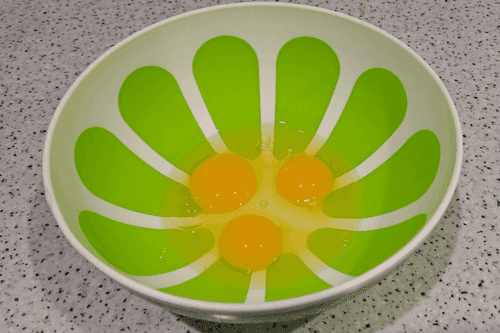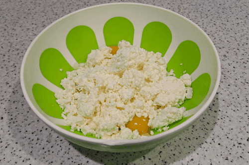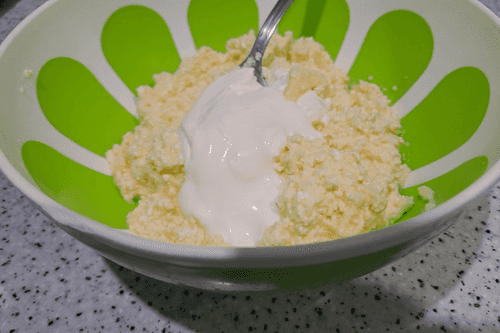 Творог перемешать с яйцами, выложить в емкость 2 столовых ложки сметаны, добавить соль и перец по вкусу.