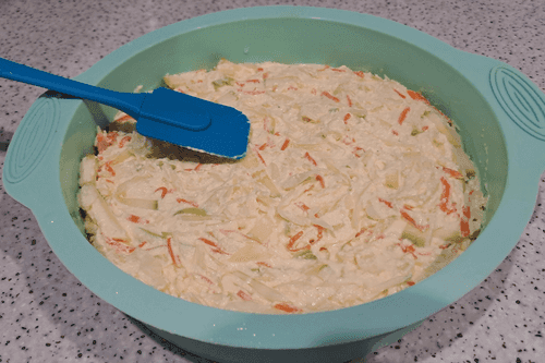 Выложить творожно-яичную смесь в форму к нарезанным овощам.