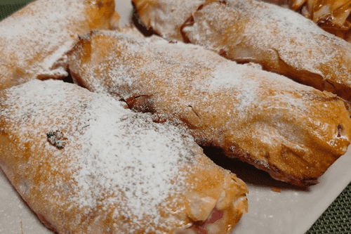Готовые конвертики посыпать сахарной пудрой и подать к столу слегка остуженными.