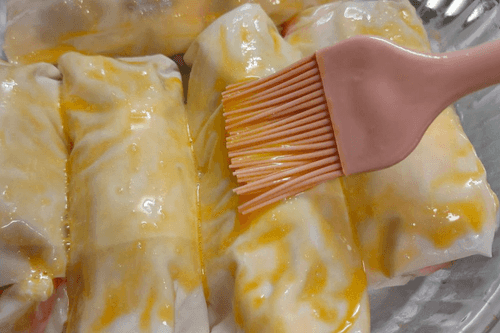 Выложить получившиеся конвертики в форму и смазать желтком. Поставить в духовку, разогретую до 180 градусов, на 30 минут.