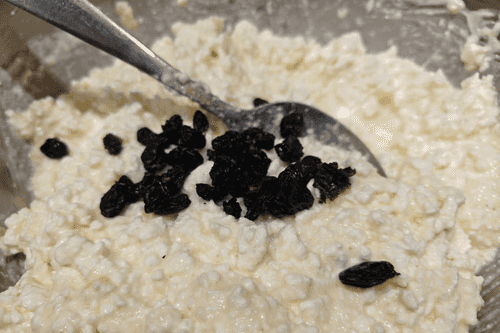 Изюм добавить в творожную массу, перемешать до однородности.