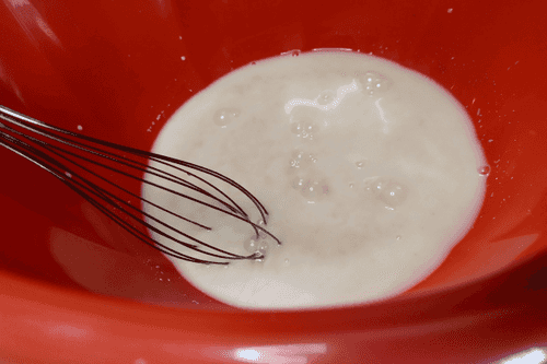 Стакан теплого молока вылить в глубокую миску, добавить сахар.