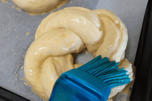 Смазать взбитым яйцом с помощью силиконовой кисти.