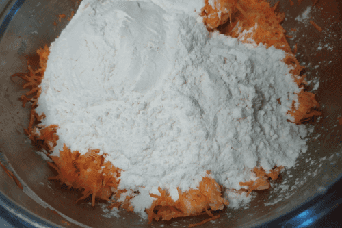 Сначала вмешать в масляную массу морковь, затем частями просеять муку.