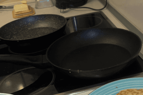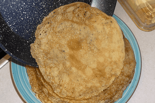 С помощью половника набирать тесто (примерно две трети половника, в зависимости от диаметра вашей сковороды) и выливать его в центр сковороды. Сковороду следует удерживать в воздухе, затем круговыми движениями равномерно распределить тесто по всей поверхности. После этого вернуть сковороду на огонь. Если теста оказалось недостаточно, быстро добавить его в пропуски.