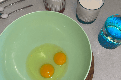 Добавить в яичную смесь молоко, воду и снова все перемешать венчиком. Добавить к тесту сахар и соль. Снова все тщательно перемешать.