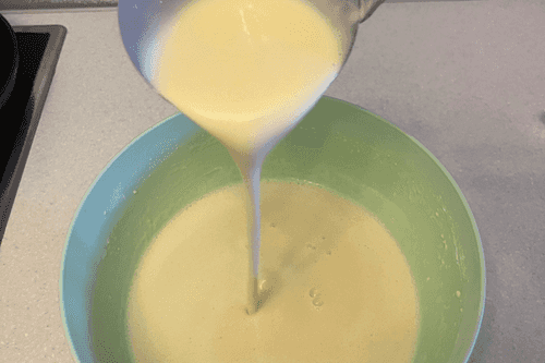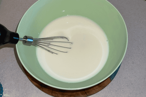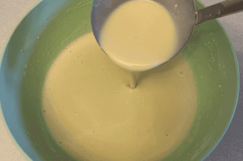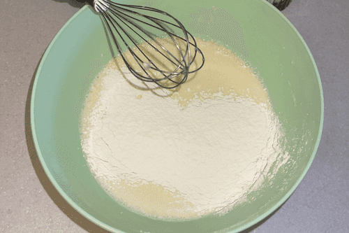 Далее добавить просеянную муку в тесто. В процессе добавления непрерывно перемешивать тесто венчиком другой рукой, чтобы предотвратить формирование комков.