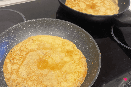 Переворачивать блин после того как края схватятся, а поверхность слегка запузырится и подрумянится. Спустя 2–3 минуты следует перевернуть блин и выпекать его еще 1–2 минуты.