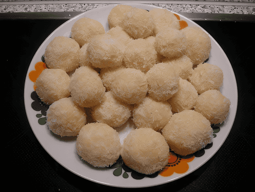 Когда масса остынет, скатать шарики, положив в центр каждого шарика по миндальному ореху, обвалять в кокосовых стружках и положить в холодильник до застывания.