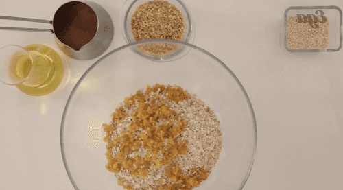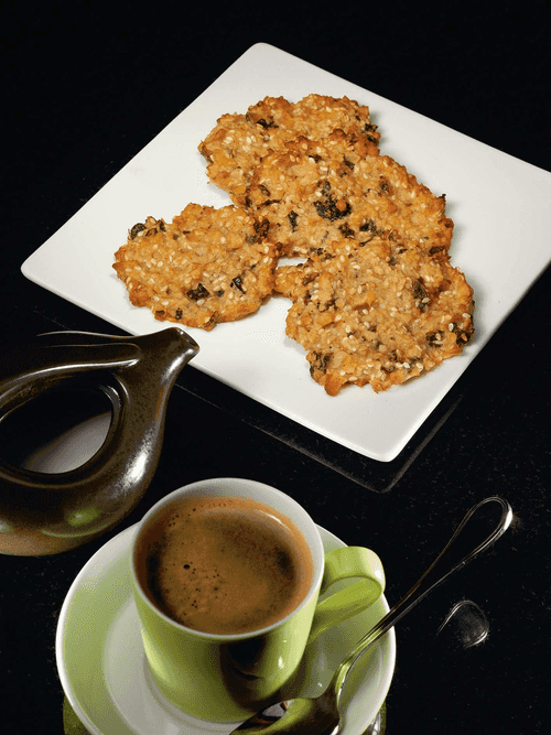 В миску насыпать овсянку, орехи, изюм, кунжут, добавить растительное масло, муку и подогретый сироп из меда, лимонного сока и специй. Замесить тесто. Овсянку лучше брать самую мелкую, «Экстра» — ту, что варить надо минуты три, не дольше.