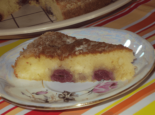 Выливаем в форму и выкладываем вишню. Пирог выпекать в разогретой духовке на 180°С 30минут.