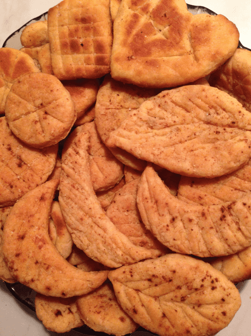Раскатать тесто, нарезать гофрированным ножом на квадратики, круги или ромбики.