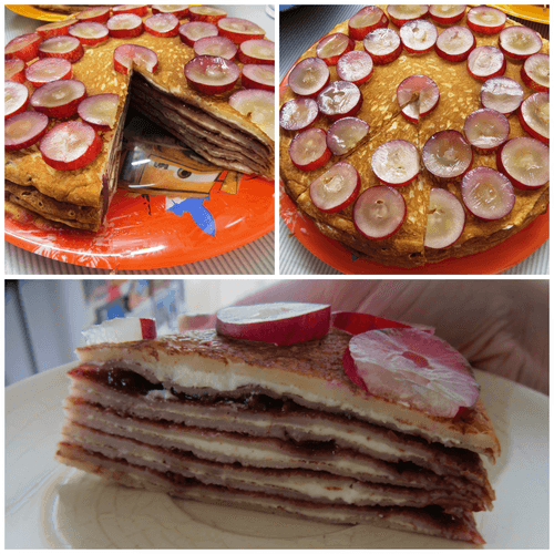 Смажьте маслом форму диаметром 20 см. Выложите 1 блин на дно формы и намажьте небольшим количеством крема, накройте другим блином и намажьте джемом. Повторяйте слои, чередуя крем и джем.