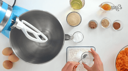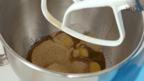 Взбить миксером на высокой скорости вместе масло, яйца и коричневый сахар. Добавить в кремообразную массу тертую морковь и ваниль и перемешать миксером до однородной консистенции. Затем частями всыпать мучную смесь и миксером на медленной скорости довести до состояния теста.