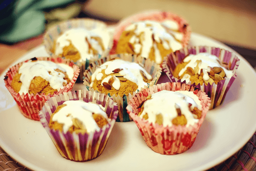 Смешайте муку, разрыхлитель, соду, корицу, имбирь, мускат и соль. В другой миске смешайте размягченное масло и сахар, добавьте яичный белок, а затем тыквенное пюре, молоко и 0,5 чайные ложки ванили. Введите сухие ингредиенты и хорошо перемешайте.