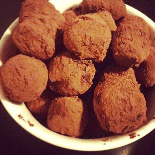 Застелите большое блюдо пергаментом. Берите по 2 чайные ложки шоколадного теста и лепите шарики. Обваляйте в какао, слегка прижимая. Выложите на приготовленное блюдо. Отправьте в холодильник на 1 час.