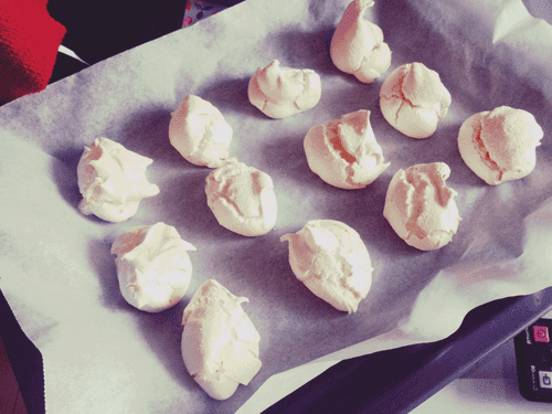 На противень, выстеленный пергаментной бумагой, выложить массу столовой ложкой, по одной ложке на пирожное.