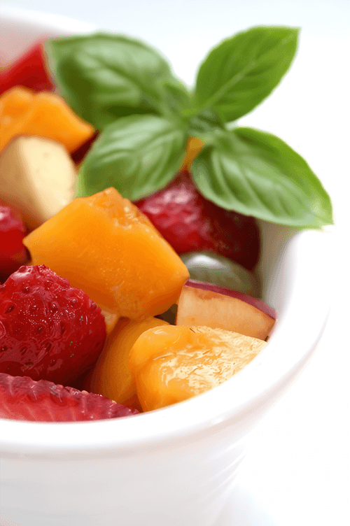 Клубнично-персиковый салат с дыней, шампанским и ягодным соусом