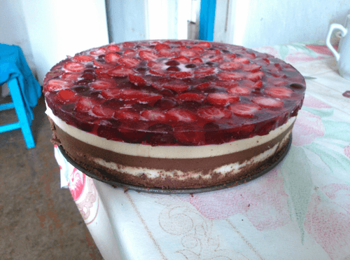 Готовим слои шоколада. На слой шоколада берем 200 грамм шоколада, 2 желтка, 20 грамм сливочного масла, 150 мл взбитых сливок,1/3 пластины желатина. На водяной бане растапливаем шоколад, желтки, сливочное масло, вводим замоченный желатин, перемешиваем. Слегка остужаем и вводим взбитые сливки. Вливаем на бисквит сперва молочный слой, далее — белый, далее — горький. Каждый слой ставим в холодильник (морозилку) на 20 минут.