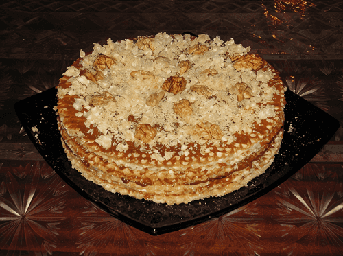 Пару вафельных коржей (примерно 8-й и 15-й) можно промазать медом. Так будет еще вкуснее.