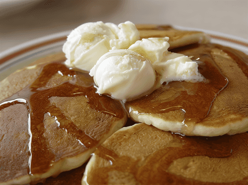 Сложите блины стопочкой и подавайте, положив сверху кусочки сливочного масла, шарики ванильного мороженого и щедро полив кленовым сиропом.