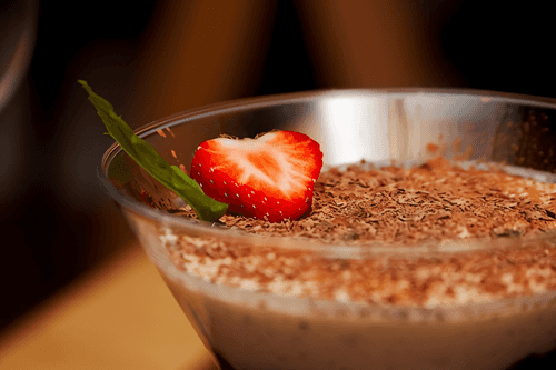 Сверху посыпьте тертой шоколадной крошкой и украсьте половинками клубники. Накройте пленкой и отправьте в холодильник на 4 часа.