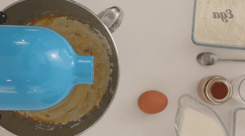Миксером на средней скорости взбить сливочное масло с сахаром (200 грамм). Займет это примерно четыре-пять минут. Затем по одному добавить яйца, потом — ваниль.