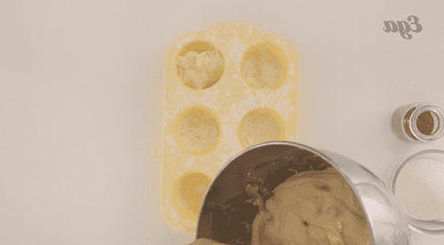 Разложить тесто в формочки. Оставшиеся 50 грамм сахара смешать с тертым мускатным орехом и посыпать шапки маффинов.