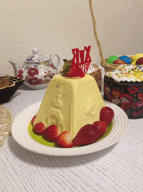 Охлажденную и застывшую пасху вынуть из формы, снять марлю, выложить на блюдо. Украсить по вкусу.
