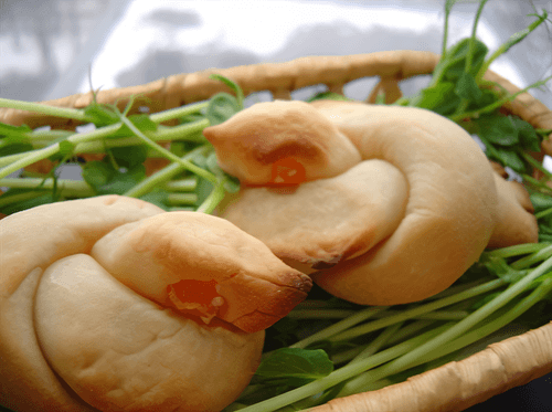 Из каждого куска слепить жаворонка (просто завязываем узелок, из одного конца которого делаем голову и украшаем изюмом или курагой, а другой сплющиваем наподобие хвостика и ножом делаем перышки). Ставим в разогретую до 180 градусов духовку и выпекаем 15-20 минут.