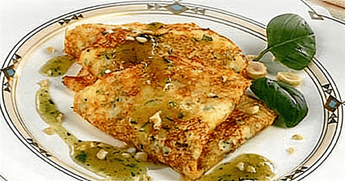 Тщательно смешать яйца со сливками, осторожно добавить в них муку, вымешать до консистенции сметаны, затем добавить тертый сыр и мелко нарезанный зеленый лук. Тщательно перемешать. Печь на растительном масле. Каждый готовый блинчик смазывать сливочным маслом. Подавать на стол горячими, завернув в каждый блинчик соленую рыбу.